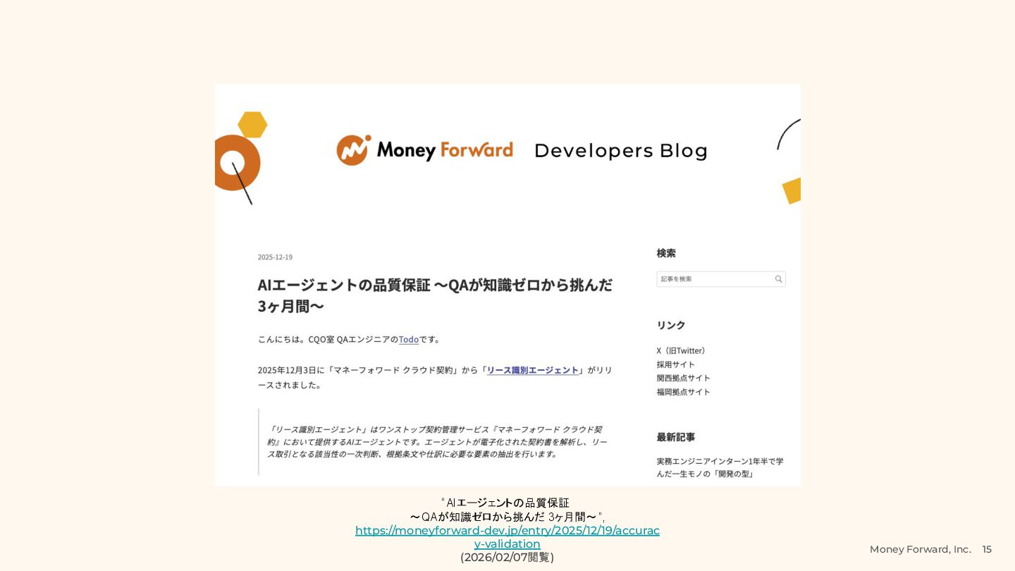 Money Forward, Inc. 15 “AIエージェントの品質保証 〜QAが知識ゼロから挑んだ 3ヶ月間〜”, https://moneyforward-dev.jp/entry/2025/12/19/accurac y-validation (2026/02/07閲覧)