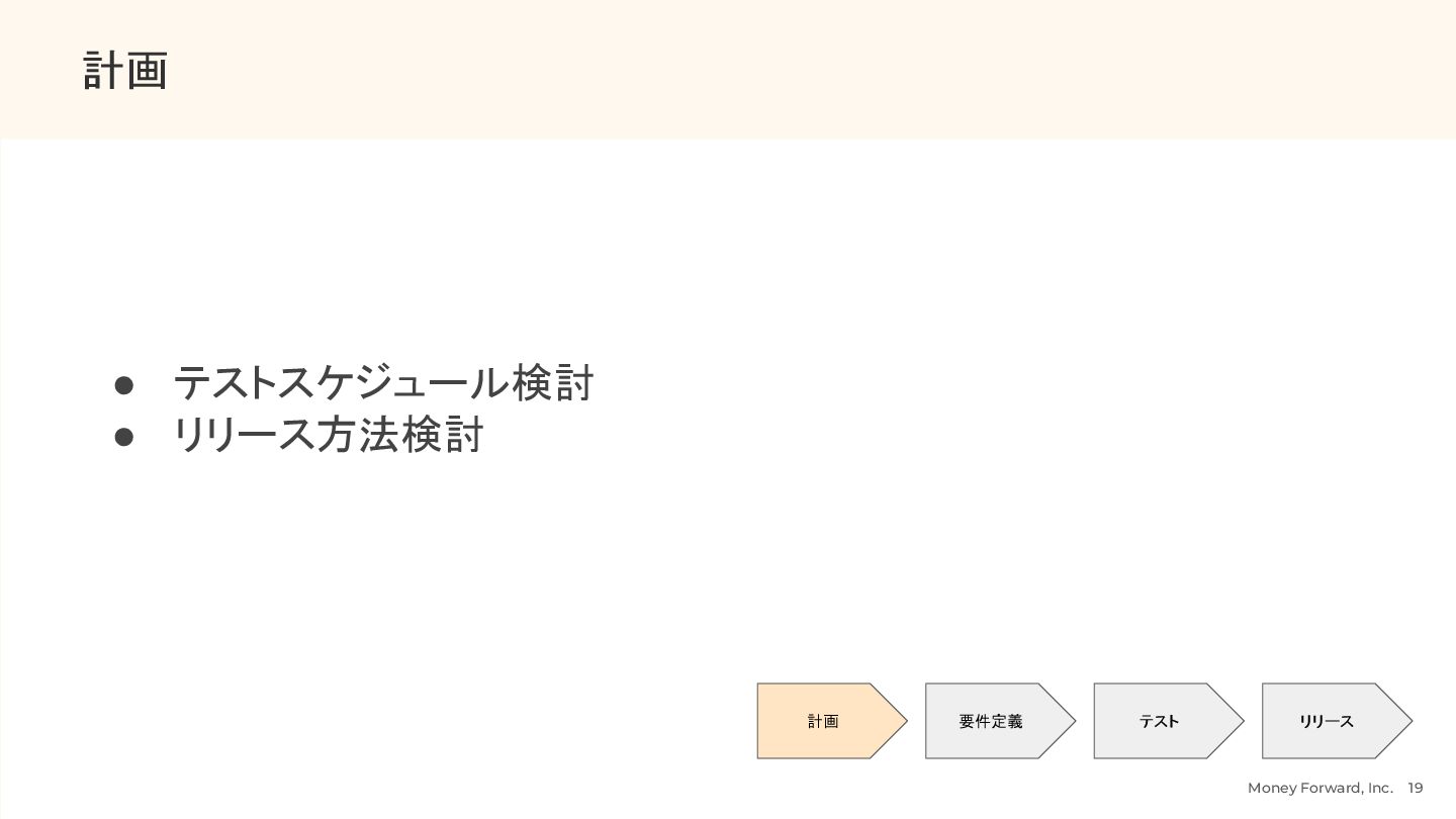 Money Forward, Inc. 19 計画 計画 要件定義 テスト リリース •