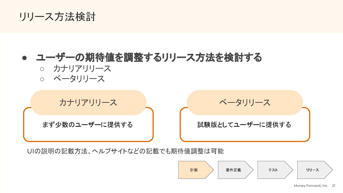 ベータリリース UIの説明の記載方法、ヘルプサイトなどの記載でも期待値調整は可能 計画 要件定義 テスト リリース 試験版としてユーザーに提供する まず少数のユーザーに提供する カナリアリリース ベータリリース