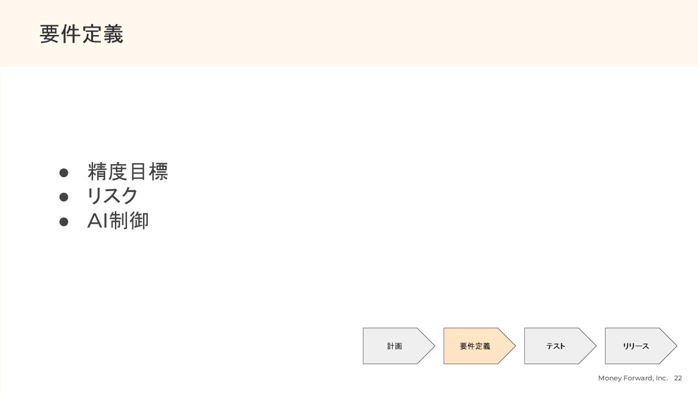 Money Forward, Inc. 22 要件定義 計画 要件定義 テスト リリース •