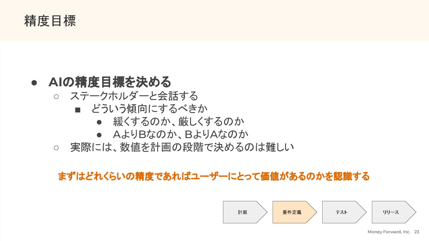 Money Forward, Inc. 23 精度目標 • AIの精度目標を決める ◦ ステークホルダーと会話する ▪