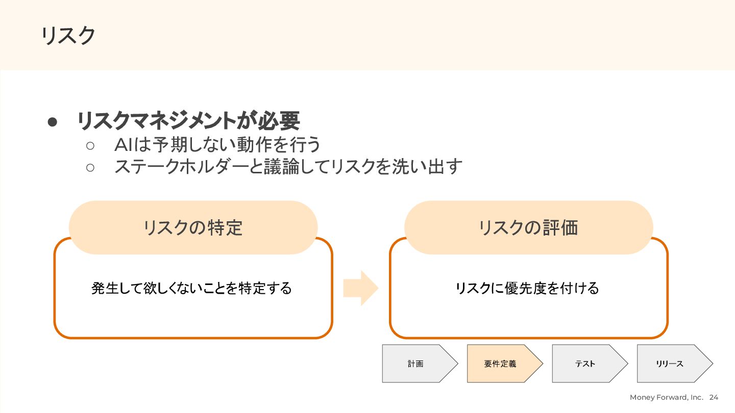 Money Forward, Inc. 24 リスク • リスクマネジメントが必要 ◦ AIは予期しない動作を行う ◦