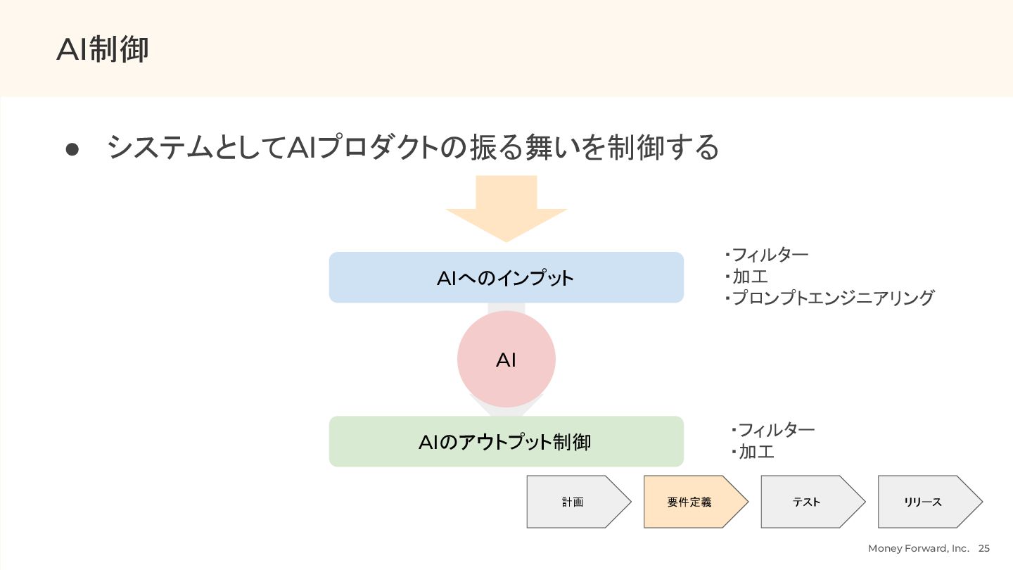 Money Forward, Inc. 25 AI制御 • システムとしてAIプロダクトの振る舞いを制御する AIへのインプット AIのアウトプット制御 AI