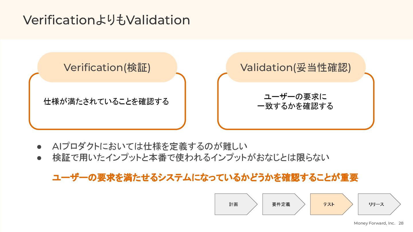 • AIプロダクトにおいては仕様を定義するのが難しい • 検証で用いたインプットと本番で使われるインプットがおなじとは限らない ユーザーの要求を満たせるシステムになっているかどうかを確認することが重要 計画 要件定義 テスト リリース