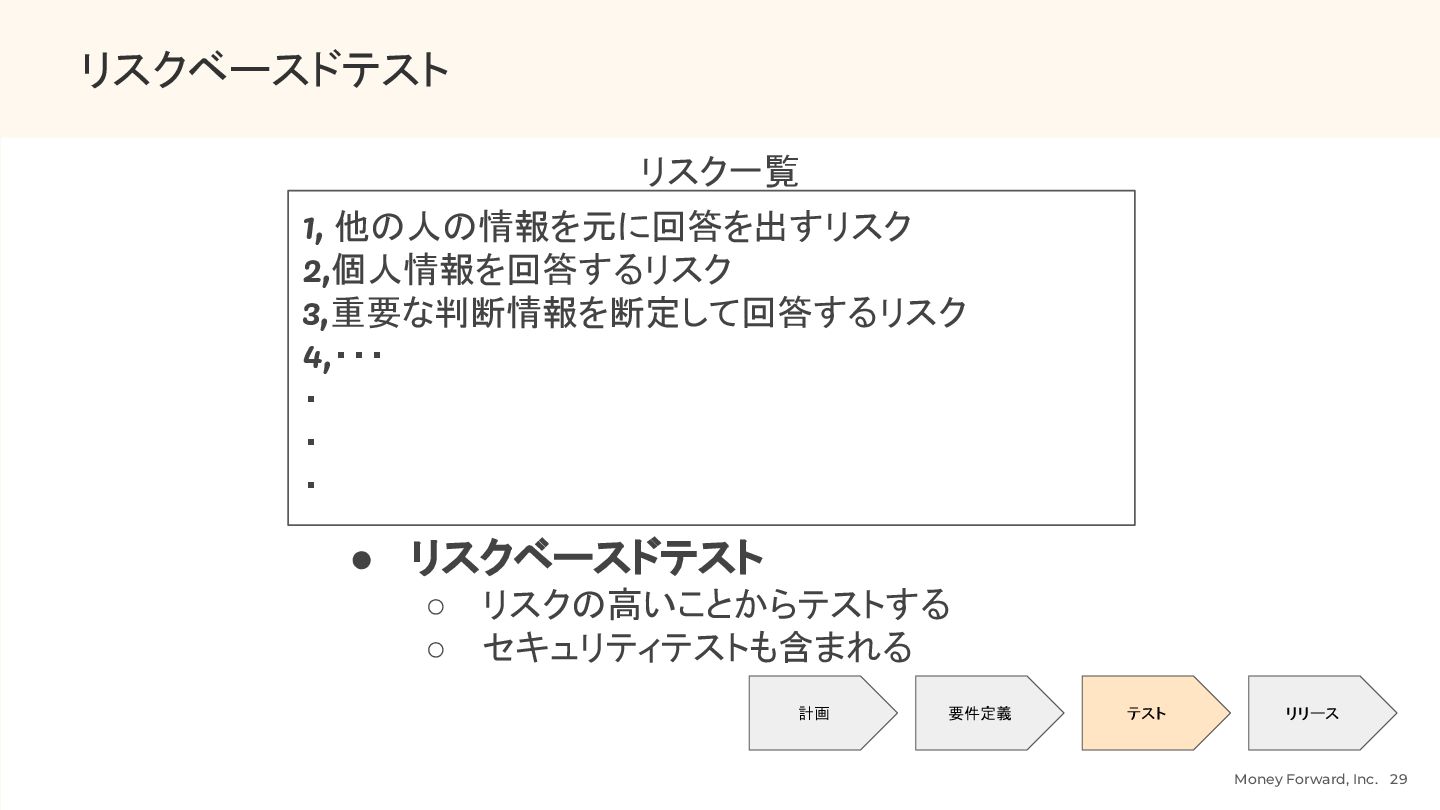 Money Forward, Inc. 29 リスクベースドテスト 1, 他の人の情報を元に回答を出すリスク 2,個人情報を回答するリスク 3,重要な判断情報を断定して回答するリスク 4,・・・