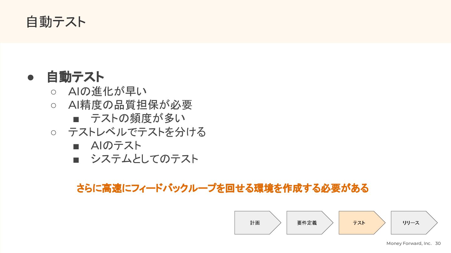 Money Forward, Inc. 30 自動テスト • 自動テスト ◦ AIの進化が早い ◦