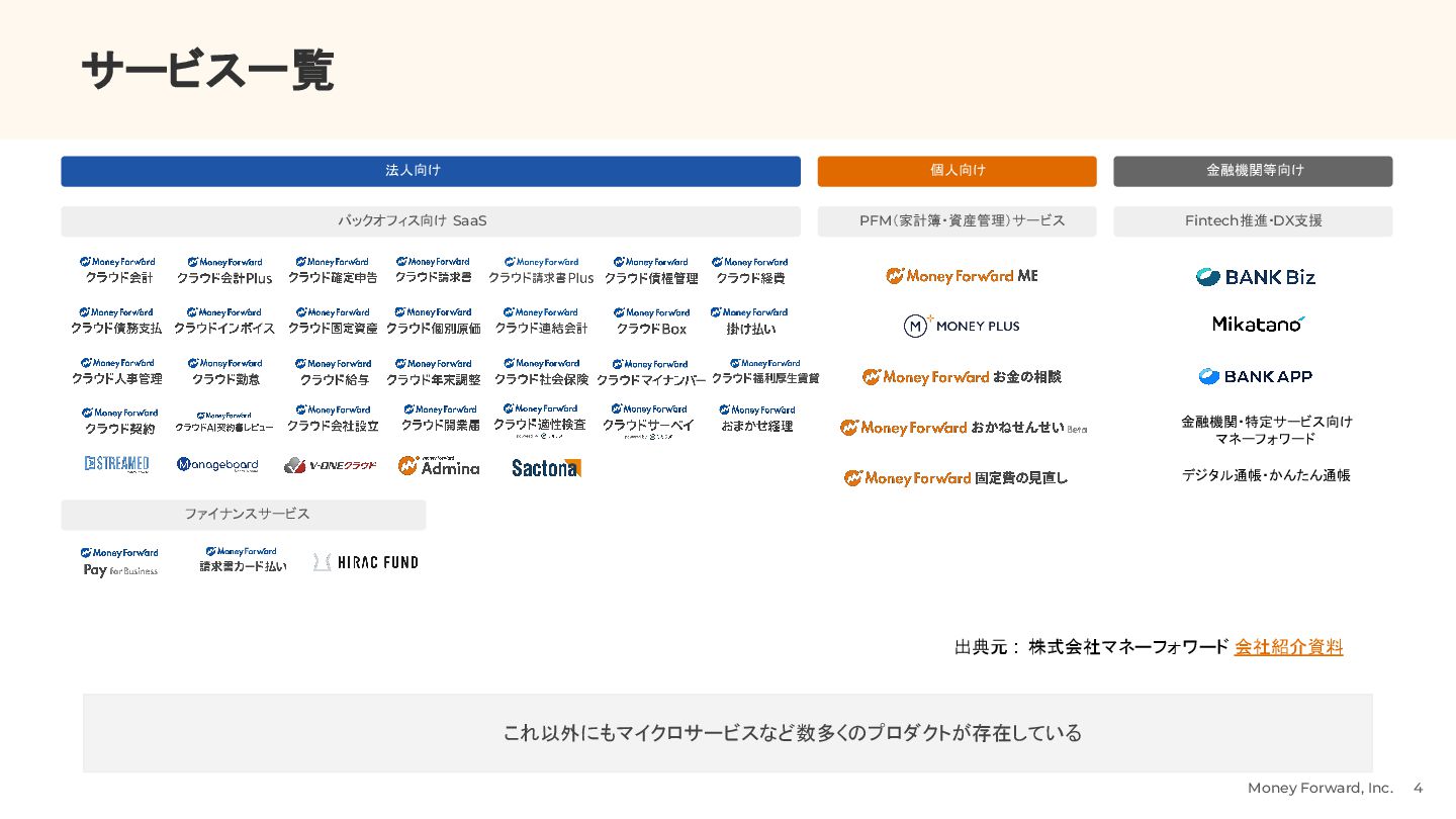 Money Forward, Inc. 4 サービス一覧 これ以外にもマイクロサービスなど数多くのプロダクトが存在している 出典元 : 株式会社マネーフォワード 会社紹介資料