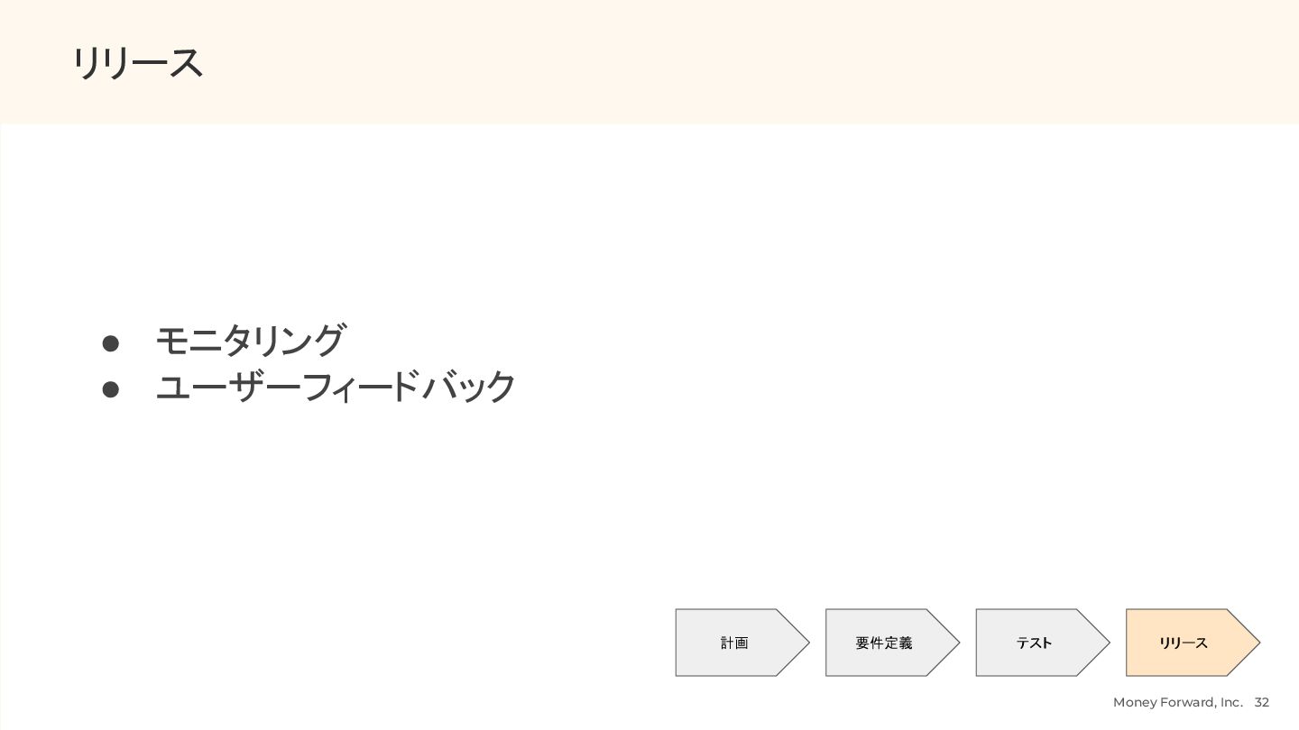 Money Forward, Inc. 32 リリース 計画 要件定義 テスト リリース •