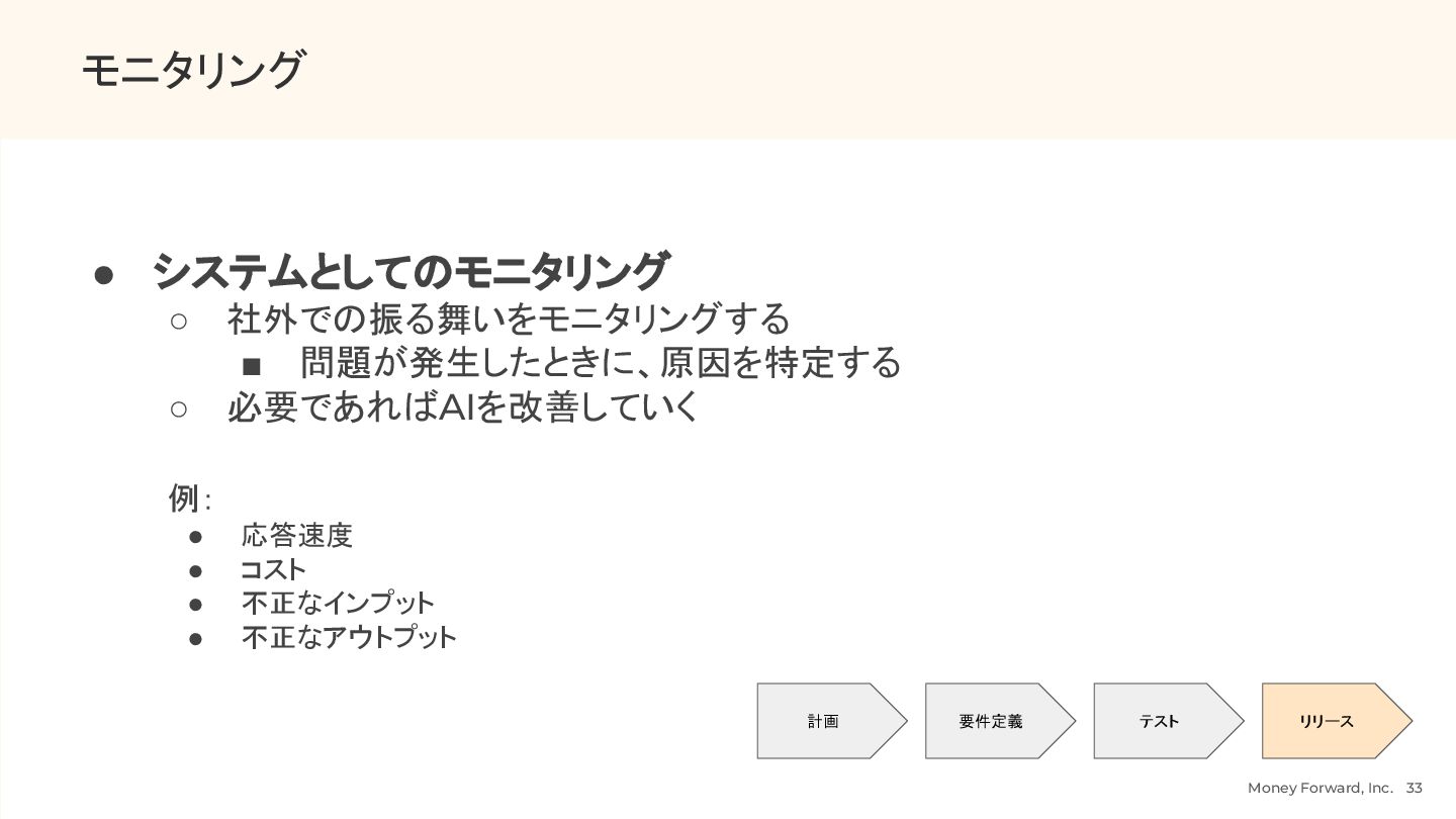 問題が発生したときに、原因を特定する ◦ 必要であればAIを改善していく 計画 要件定義 テスト リリース 例: • 応答速度 • コスト • 不正なインプット • 不正なアウトプット