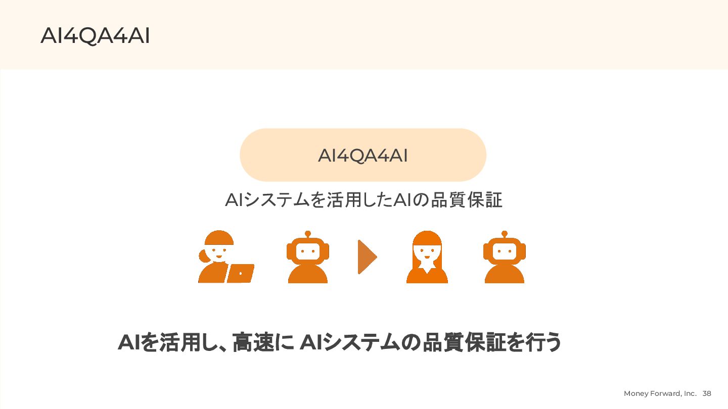 Money Forward, Inc. 38 AI4QA4AI AIシステムを活用したAIの品質保証 AI4QA4AI AIを活用し、高速に AIシステムの品質保証を行う