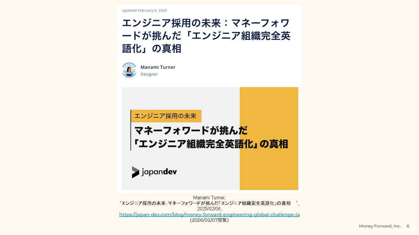 Money Forward, Inc. 6 Manami Turner, “エンジニア採用の未来:マネーフォワードが挑んだ「エンジニア組織完全英語化」の真相 ”, 2025/02/06, https://japan-dev.com/blog/money-forward-engineering-global-challenge-ja