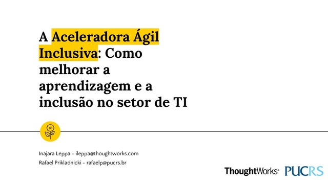 As Aceleradoras ágil e inclusiva são programas educacionais sem fins lucrativos através de uma parceria universidade-empresa, em que buscamos mais diversidade e inclusão para ambientes de tecnologia em contexto de agilidade. Nesta apresentação vamos explicar a evolução, estágio atual e os resultados dos programas. Compartilharemos alguns aprendizados para quem estiver em busca de conselhos práticos sobre como cultivar ambientes mais inclusivos no contexto ágil.