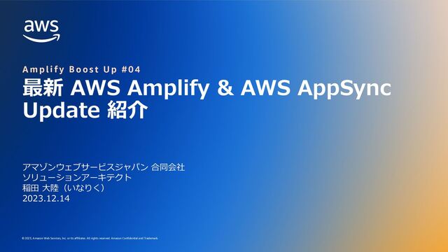 or its affiliates. All rights reserved. Amazon Confidential and Trademark. (これまでの)AWS Amplify の 4 つのコンポーネント Amplify CLI Web やモバイルアプリケーションを⼀般的なユースケースベースのガイド付きワークフローで バックエンドを簡単に作成、管理するツール Amplify Libraries Web やモバイルアプリケーションと AWS を統合するためのユースケース中⼼のライブラリ Amplify Hosting 継続的デプロイメントを管理し、モダンな Web アプリケーションをビルド、テスト、デプロイ、 そしてホスティングするための AWS サービス Amplify Studio AWS 上に最⼩限のコーディングでフロントからバックまでのアプリケーションを作成できる ビジュアルな開発環境