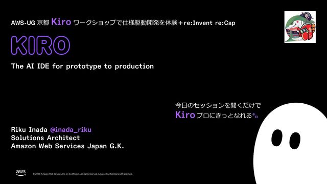 rights reserved. Amazon Confidential and Trademark. The AI IDE for prototype to production Speaker name (pronouns) AWS-UG 京都 Kiro ワークショップで仕様駆動開発を体験+re:Invent re:Cap Riku Inada @inada_riku Solutions Architect Amazon Web Services Japan G.K. 今⽇のセッションを聞くだけで Kiro プロにきっとなれる㌔