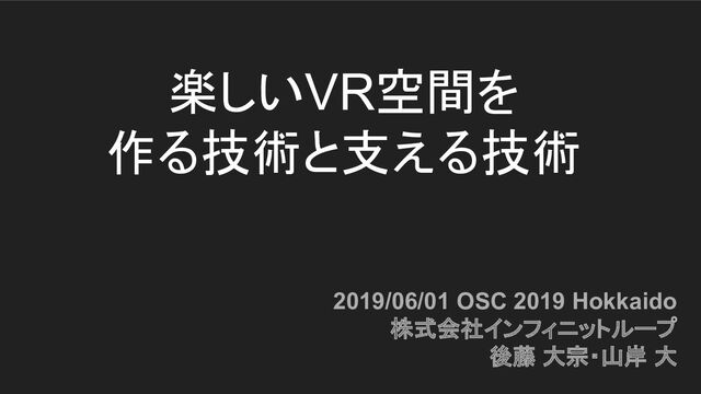 楽しいVR空間を 作る技術と支える技術 2019/06/01 OSC 2019 Hokkaido 株式会社インフィニットループ 後藤 大宗・山岸 大