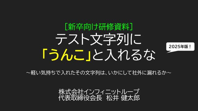 インフィニットループ社内の新卒向け研修で使われた資料、テスト文字列に「うんこ」と入れるな(事例などを追記した2025年版)です。 詳しくはこちらのページをご参照ください。 https://www.infiniteloop.co.jp/tech-blog/2025/05/unko2025/