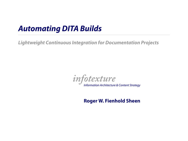 This presentation covers several approaches to automated XML publishing and provides simple examples for lightweight continuous integration from scheduled builds to watched folders and commit hooks to more complex hosted systems.