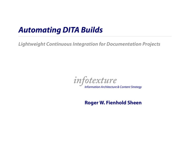 This presentation covers several approaches to automated XML publishing and provides simple examples for lightweight continuous integration from scheduled builds to watched folders and commit hooks to more complex hosted systems.