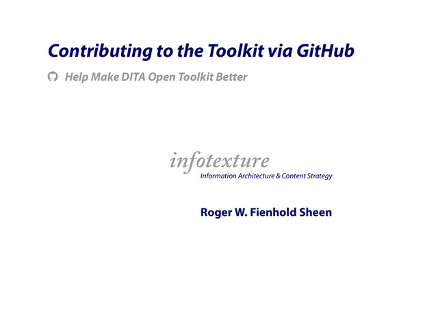 Now that the toolkit is hosted on GitHub, it's easier than ever to contribute changes to the DITA-OT code. In this 10-minute lightning talk, Roger demonstrates how to fork the repository, create a new branch, change the necessary files and submit a pull request.