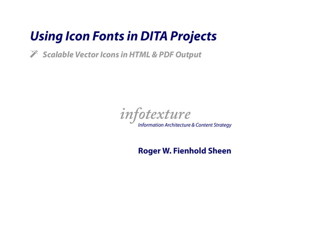 Modern Web applications use fonts with scalable vector icons that render sharply at any resolution. Similar techniques can be used in DITA projects to include icons from the user interface in output. This session presents several options for integrating icon fonts in DITA projects and includes markup examples and renderer configurations to include icon glyphs in multiple output formats.