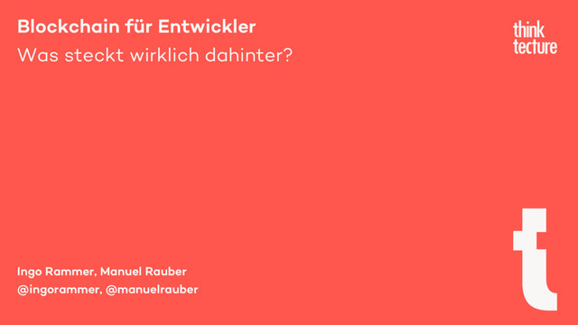 Magic • Vorbereiten – Neue Usecases Nächste Schritte • Tools in diesem Talk: Tendermint, Ethereum, Quorum, Hyperledger Fabric • Client/Server/Contract-Kommunikation: web3 (Ethereum), Tendermint ABCI • Samples: https://github.com/thinktecture/basta-spring-2018-blockchain-demo • Slides: https://speakerdeck.com/ingorammer • Contact: @ingorammer, @manuelrauber