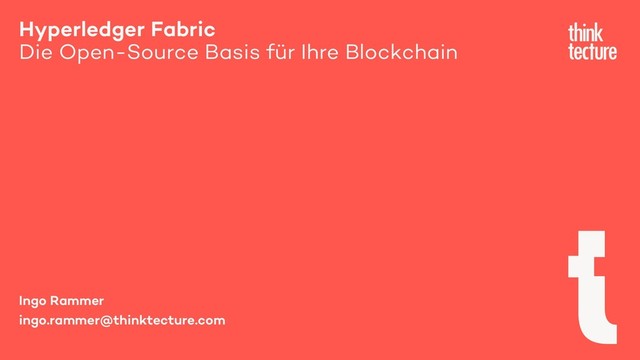 (20 Personen) technischen Beratungsunternehmen für Software- Architekten und –Entwickler Mein persönlicher Fokus: Blockchain Technologien für B2B-Verwendung, von den Tiefen der Technologie bis hin zu ISO TC 307, Enterprise Ethereum Alliance und Hyperledger Foundation Slides: https://thinktecture.com/presentations Kontakt: [email protected] Twitter: @ingorammer