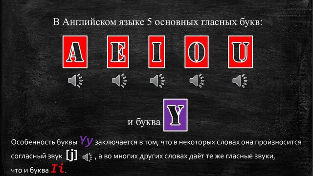 буквы Yyзаключается в том, что в некоторых словах она произносится cогласный звук [j] , а во многих других словах даёт те же гласные звуки, что и буква Ii.
