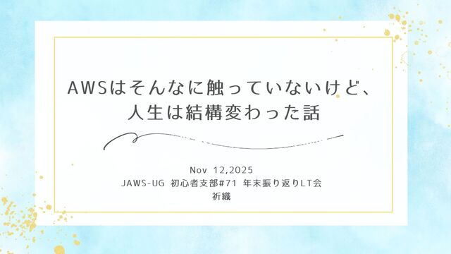 AWSはそんなに触っていないけど、 人生は結構変わった話 Nov 12,2025 JAWS-UG 初心者支部#71 年末振り返りLT会 祈織