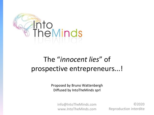 We translated and adapted a remarkable presentation (“the lies of the novice entrepreneur”) created by Bruno Wattenbergh. We detail here the risks that a novice entrepreneur can pose for his idea.