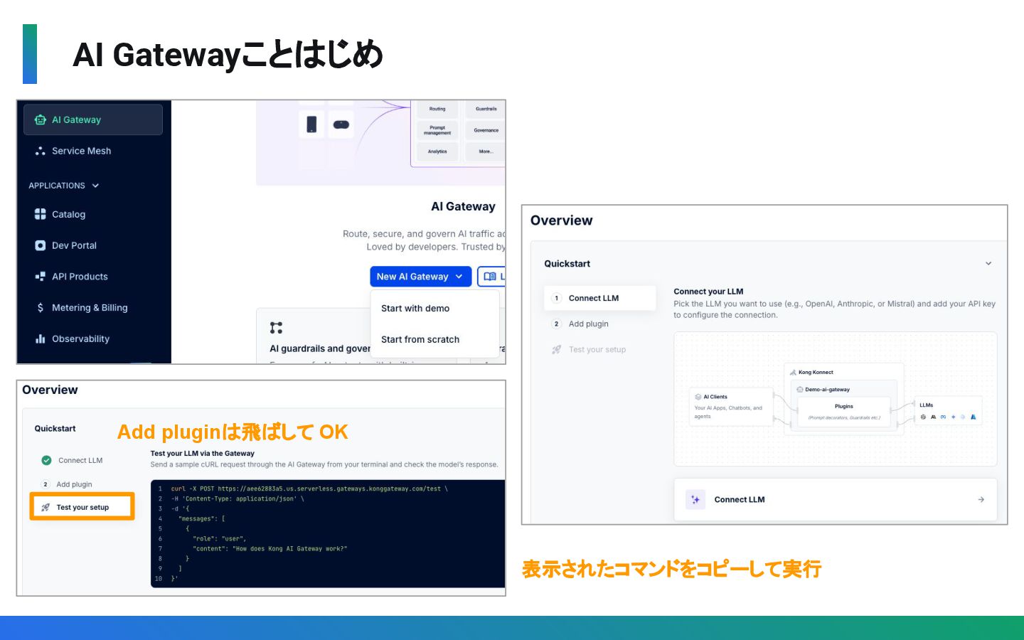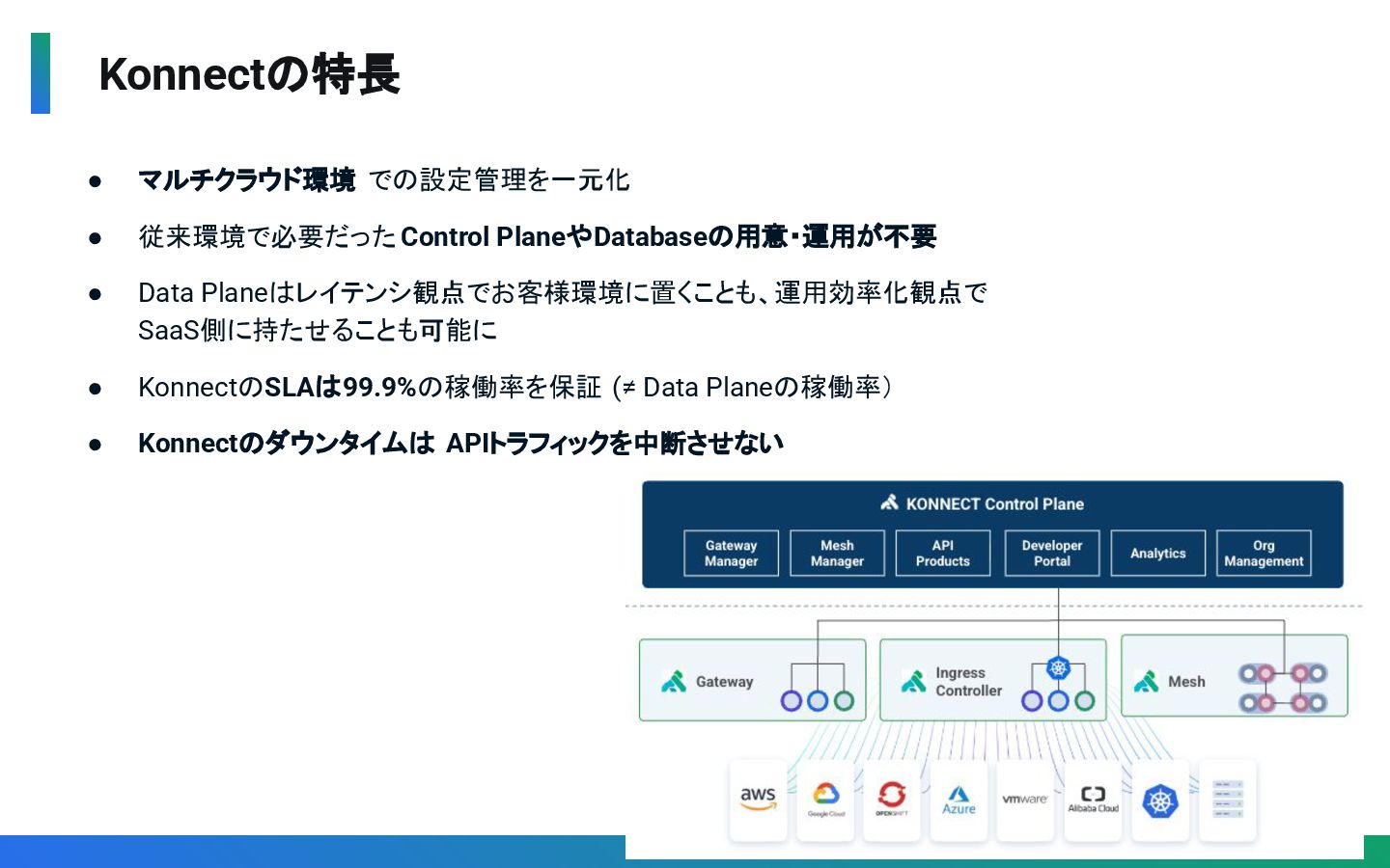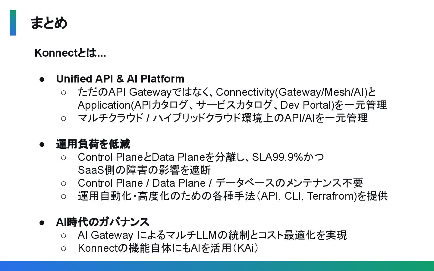 Gatewayではなく、Connectivity(Gateway/Mesh/AI)と Application(APIカタログ、サービスカタログ、Dev Portal)を一元管理 ◦ マルチクラウド / ハイブリッドクラウド環境上のAPI/AIを一元管理 • 運用負荷を低減 ◦ Control PlaneとData Planeを分離し、SLA99.9%かつ SaaS側の障害の影響を遮断 ◦ Control Plane / Data Plane / データベースのメンテナンス不要 ◦ 運用自動化・高度化のための各種手法(API, CLI, Terrafrom)を提供 • AI時代のガバナンス ◦ AI Gateway によるマルチLLMの統制とコスト最適化を実現 ◦ Konnectの機能自体にもAIを活用(KAi)
