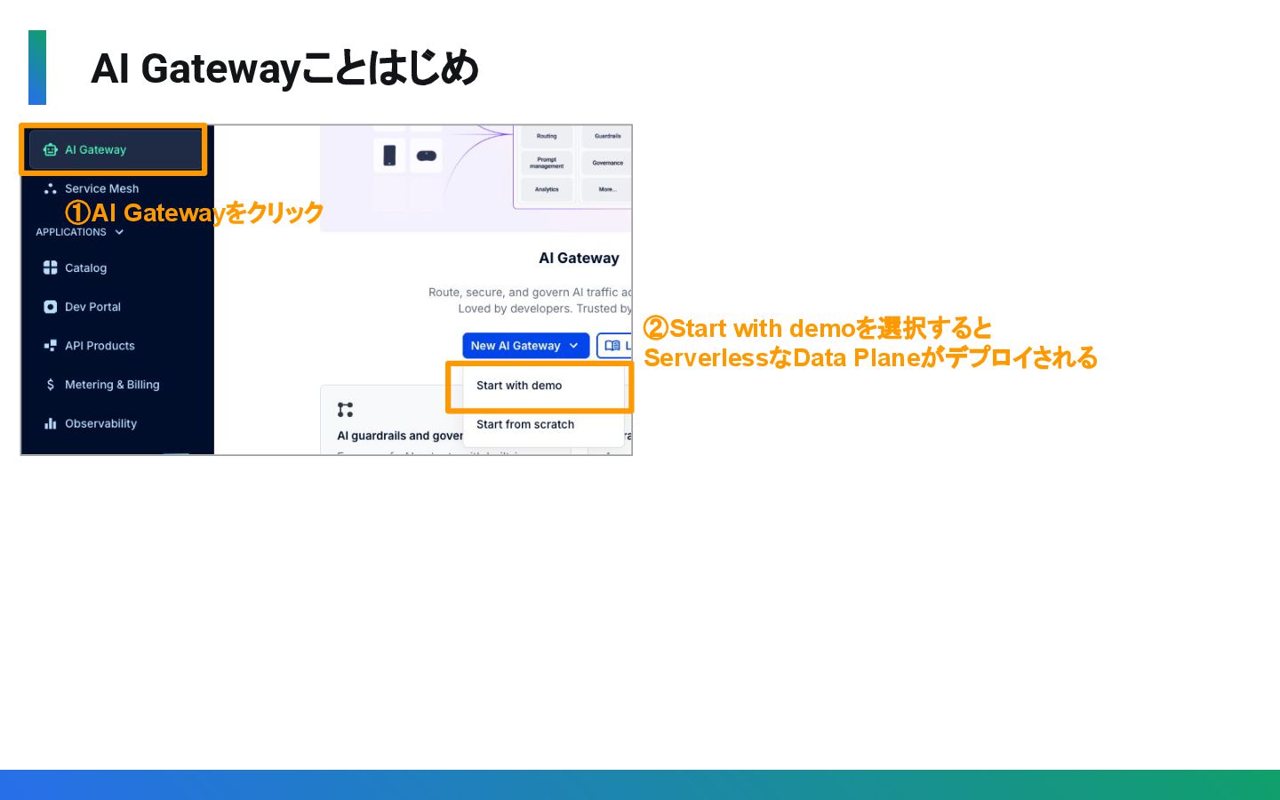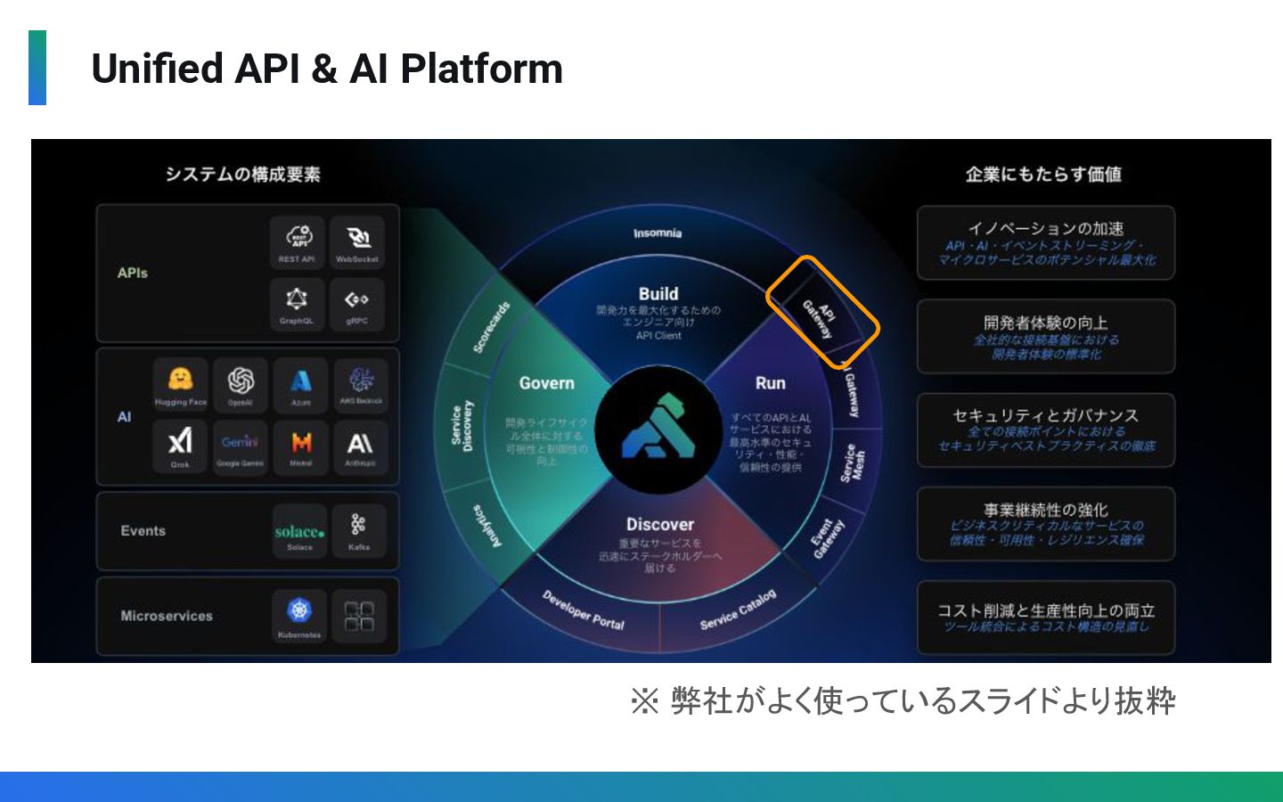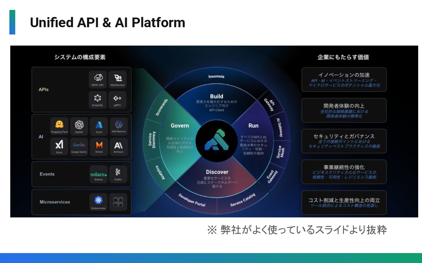Gatewayではなく、Connectivity(Gateway/Mesh/AI)と Application(APIカタログ、サービスカタログ、Dev Portal)を一元管理 ◦ マルチクラウド / ハイブリッドクラウド環境上のAPI/AIを一元管理 • 運用負荷を低減 ◦ Control PlaneとData Planeを分離し、SLA99.9%かつ SaaS側の障害の影響を遮断 ◦ Control Plane / Data Plane / データベースのメンテナンス不要 ◦ 運用自動化・高度化のための各種手法(API, CLI, Terrafrom)を提供 • AI時代のガバナンス ◦ AI Gateway によるマルチLLMの統制とコスト最適化を実現 ◦ Konnectの機能自体にもAIを活用(KAi)