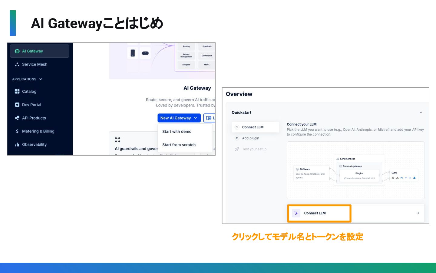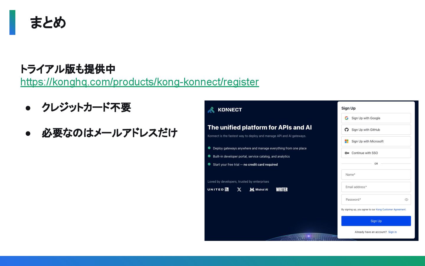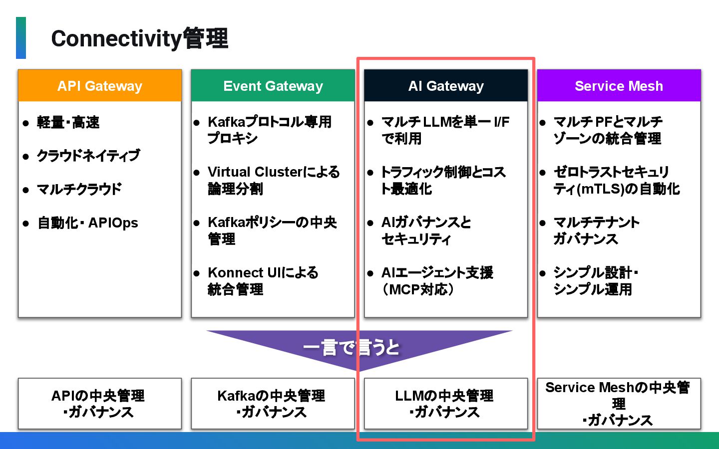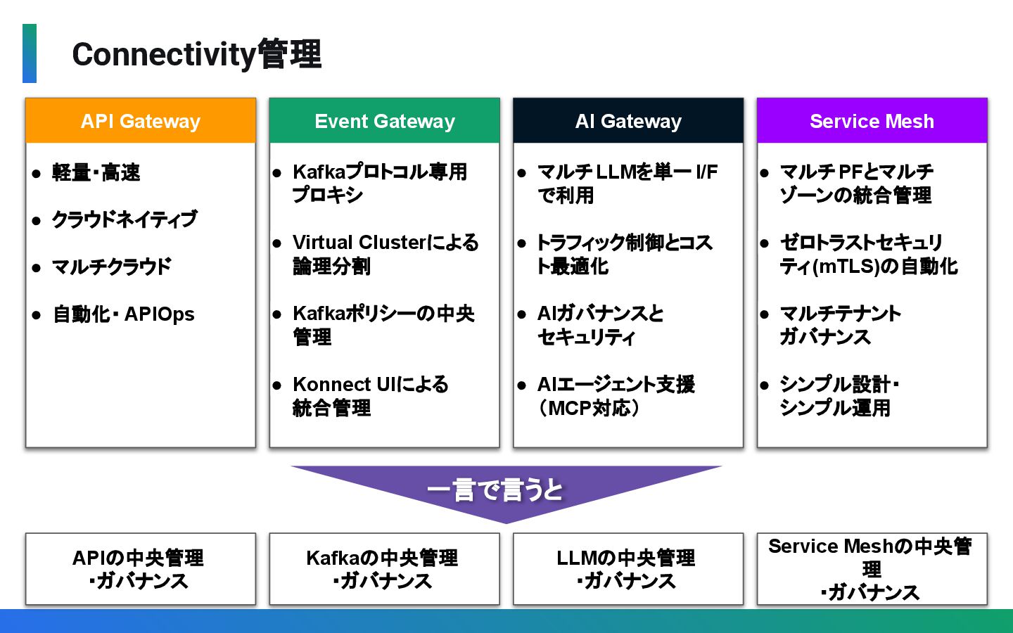 軽量・高速 • クラウドネイティブ • マルチクラウド • 自動化・ APIOps • Kafkaプロトコル専用 プロキシ • Virtual Clusterによる 論理分割 • Kafkaポリシーの中央 管理 • Konnect UIによる 統合管理 • マルチLLMを単一I/F で利用 • トラフィック制御とコス ト最適化 • AIガバナンスと セキュリティ • AIエージェント支援 (MCP対応) • マルチPFとマルチ ゾーンの統合管理 • ゼロトラストセキュリ ティ(mTLS)の自動化 • マルチテナント ガバナンス • シンプル設計・ シンプル運用 APIの中央管理 ・ガバナンス Kafkaの中央管理 ・ガバナンス LLMの中央管理 ・ガバナンス Service Meshの中央管 理 ・ガバナンス 一言で言うと