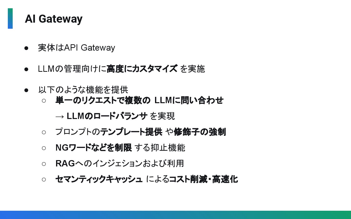 11. AI Gateway • 実体はAPI Gateway • LLMの管理向けに高度にカスタマイズ を実施 • 以下のような機能を提供