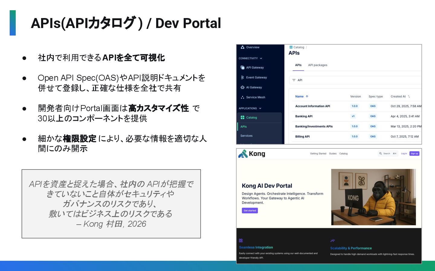 併せて登録し、正確な仕様を全社で共有 • 開発者向けPortal画面は高カスタマイズ性 で 30以上のコンポーネントを提供 • 細かな権限設定 により、必要な情報を適切な人 間にのみ開示 APIを資産と捉えた場合、社内の APIが把握で きていないこと自体がセキュリティや ガバナンスのリスクであり、 敷いてはビジネス上のリスクである – Kong 村田, 2026