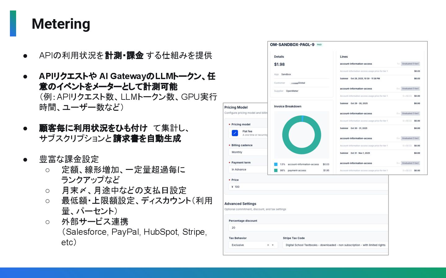 時間、ユーザー数など) • 顧客毎に利用状況をひも付け て集計し、 サブスクリプションと 請求書を自動生成 • 豊富な課金設定 ◦ 定額、線形増加、一定量超過毎に ランクアップなど ◦ 月末〆、月途中などの支払日設定 ◦ 最低額・上限額設定、ディスカウント(利用 量、パーセント) ◦ 外部サービス連携 (Salesforce, PayPal, HubSpot, Stripe, etc)