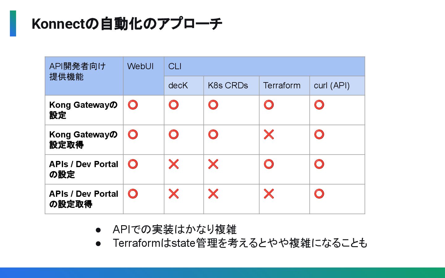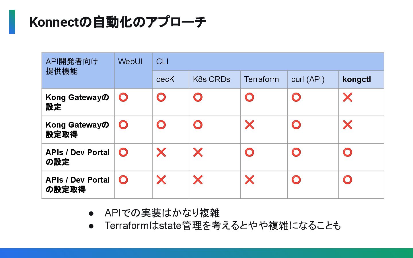 (API) Kong Gatewayの 設定 ⭕ ⭕ ⭕ ⭕ ⭕ Kong Gatewayの 設定取得 ⭕ ⭕ ⭕ ❌ ⭕ APIs / Dev Portal の設定 ⭕ ❌ ❌ ⭕ ⭕ APIs / Dev Portal の設定取得 ⭕ ❌ ❌ ❌ ⭕ • APIでの実装はかなり複雑 • Terraformはstate管理を考えるとやや複雑になることも
