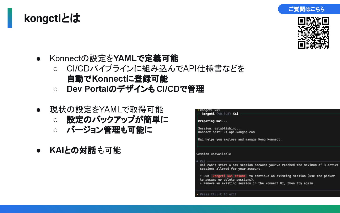 • 現状の設定をYAMLで取得可能 ◦ 設定のバックアップが簡単に ◦ バージョン管理も可能に • KAiとの対話も可能 ご質問はこちら