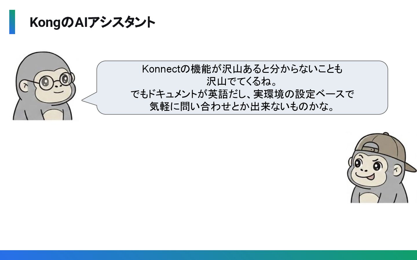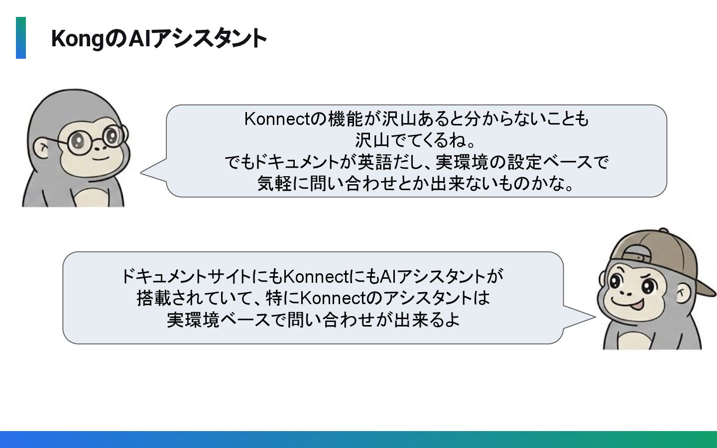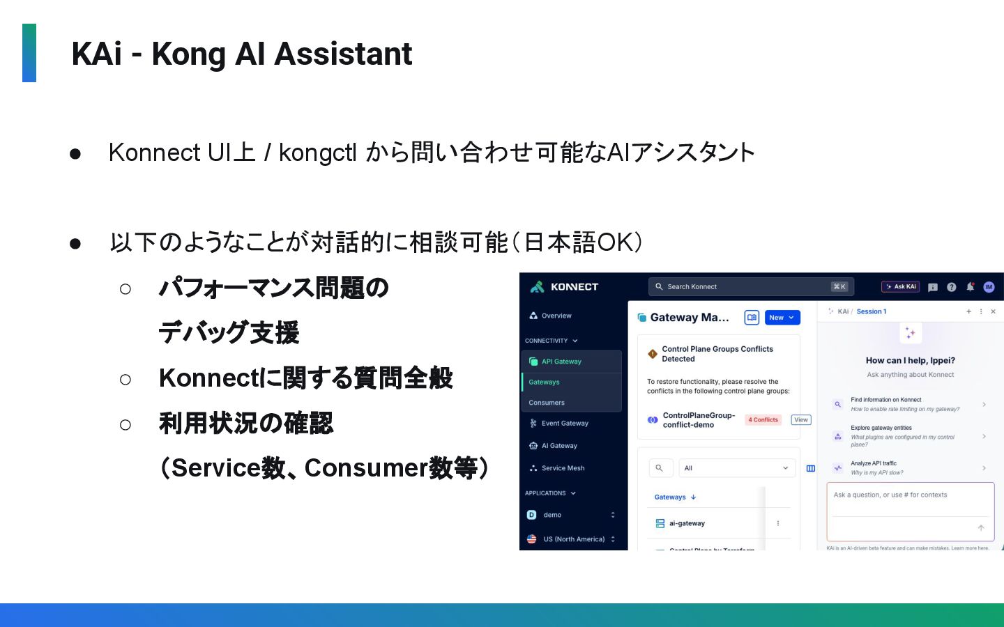 から問い合わせ可能なAIアシスタント • 以下のようなことが対話的に相談可能(日本語OK) ◦ パフォーマンス問題の デバッグ支援 ◦ Konnectに関する質問全般 ◦ 利用状況の確認 (Service数、Consumer数等)