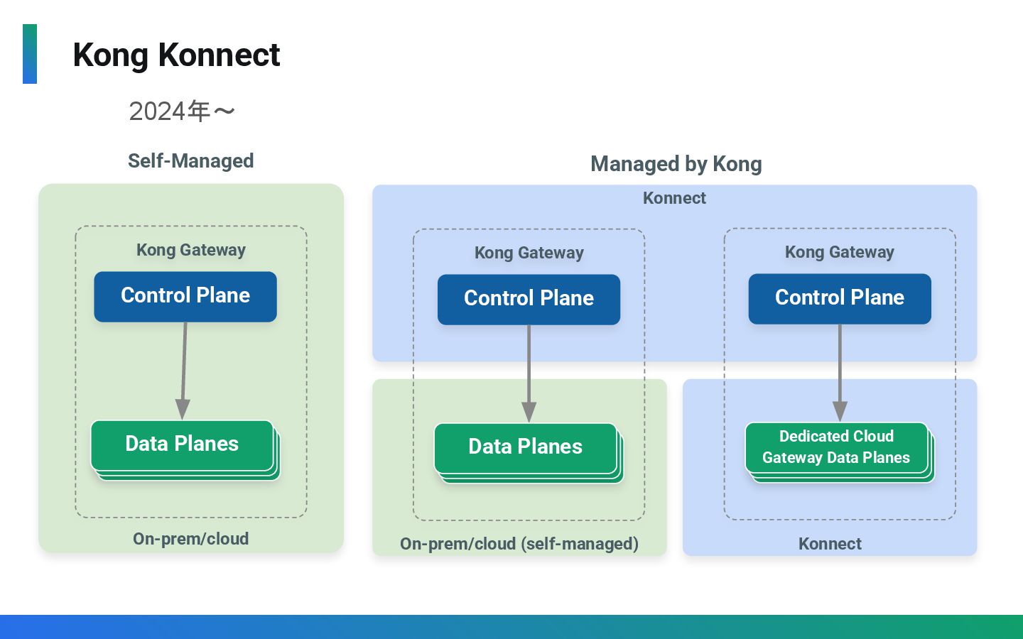 2024年〜 On-prem/cloud (self-managed) Konnect Managed by Kong Konnect Kong Gateway Control Plane Data Planes Kong Gateway Control Plane Dedicated Cloud Gateway Data Planes