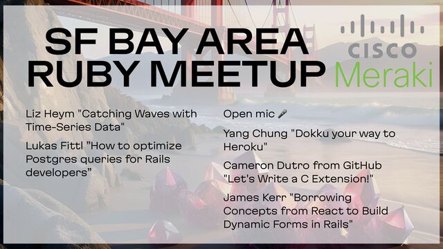 Liz Heym "Catching Waves with Time-Series Data" Lukas Fittl ”How to optimize Postgres queries for Rails developers” Open mic 🎤 Yang Chung "Dokku your way to Heroku" Cameron Dutro from GitHub "Let's Write a C Extension!" James Kerr "Borrowing Concepts from React to Build Dynamic Forms in Rails"