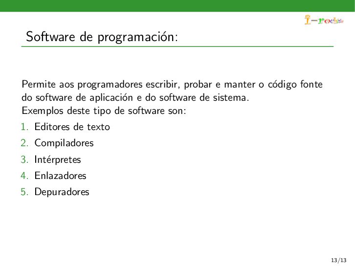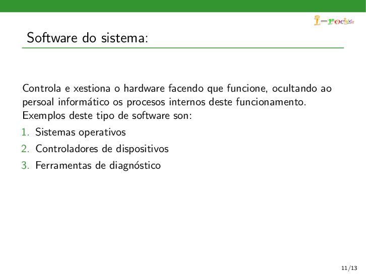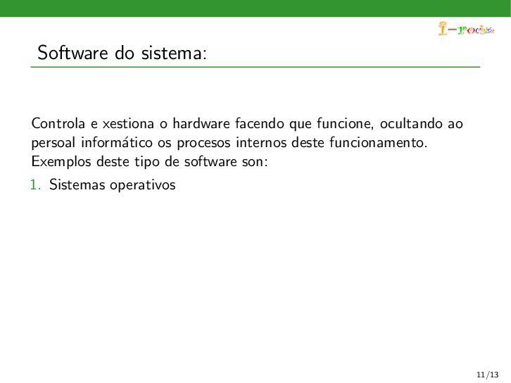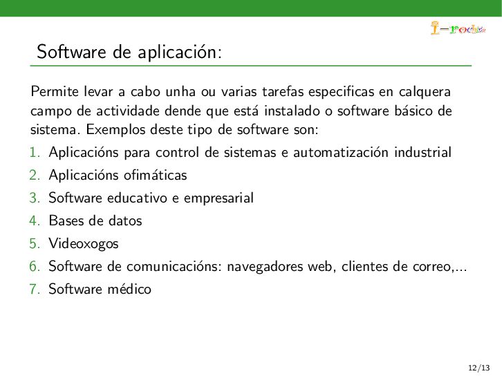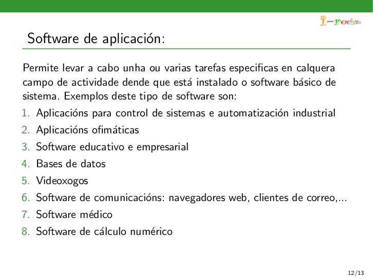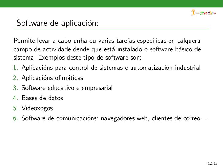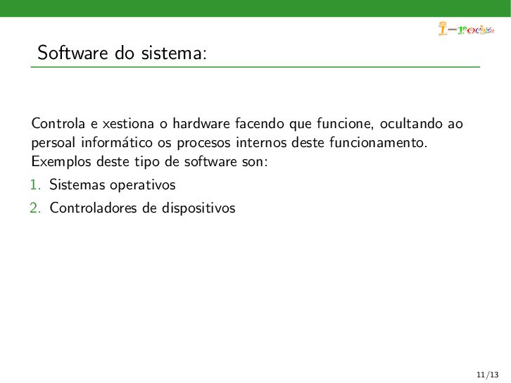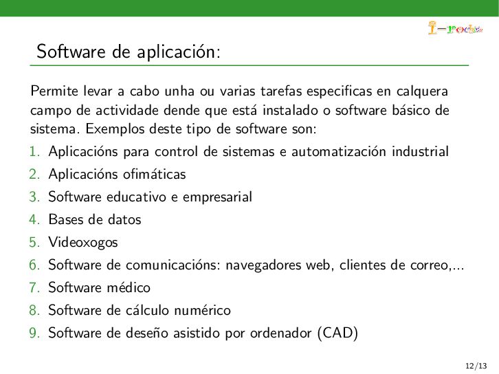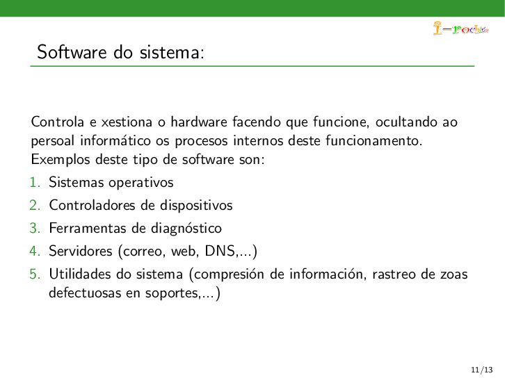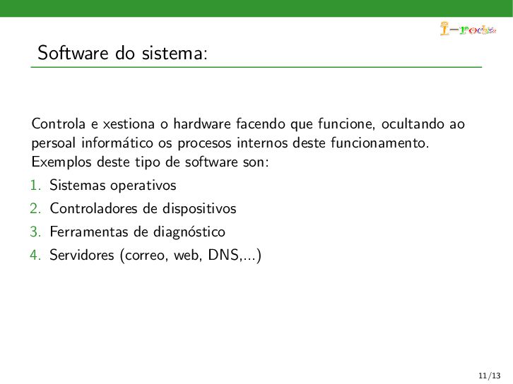 funcione, ocultando ao persoal inform´ atico os procesos internos deste funcionamento. Exemplos deste tipo de software son: 1. Sistemas operativos 2. Controladores de dispositivos 3. Ferramentas de diagn´ ostico 4. Servidores (correo, web, DNS,...) 5. Utilidades do sistema (compresi´ on de informaci´ on, rastreo de zoas defectuosas en soportes,...) 11/13