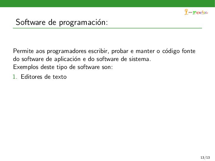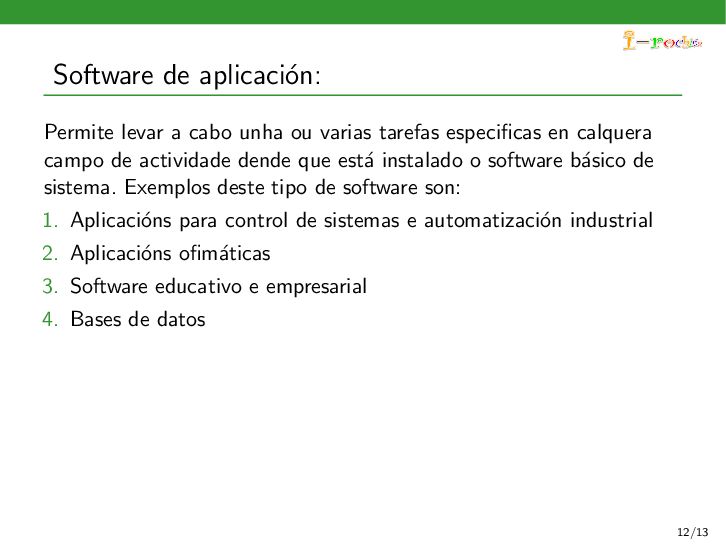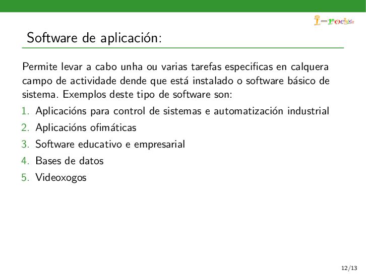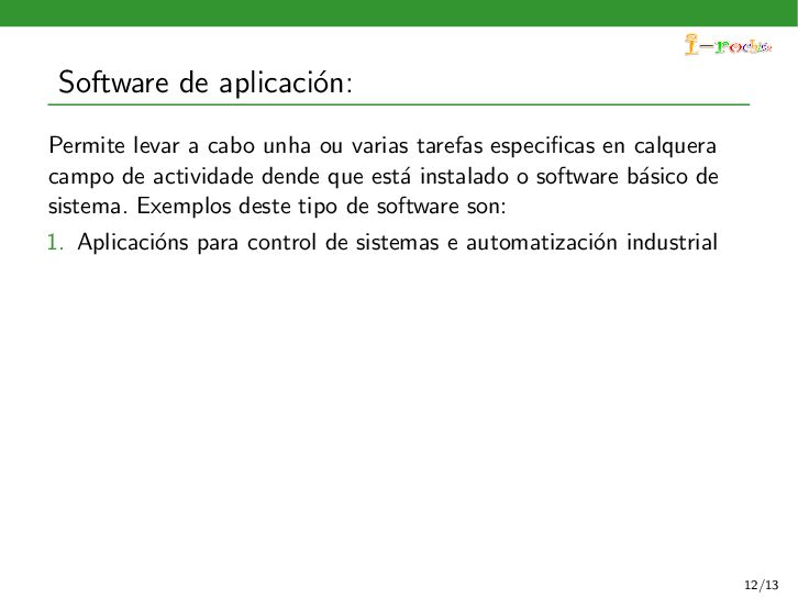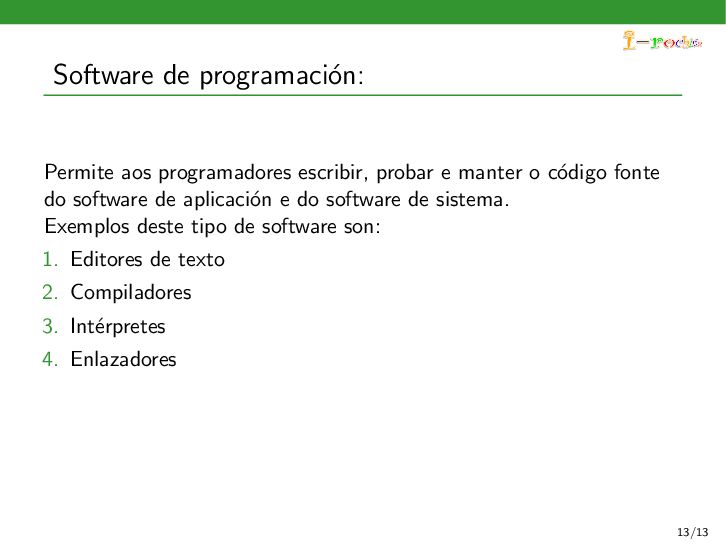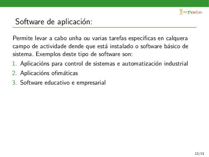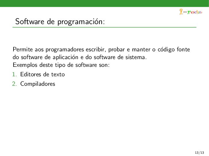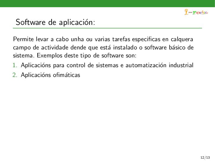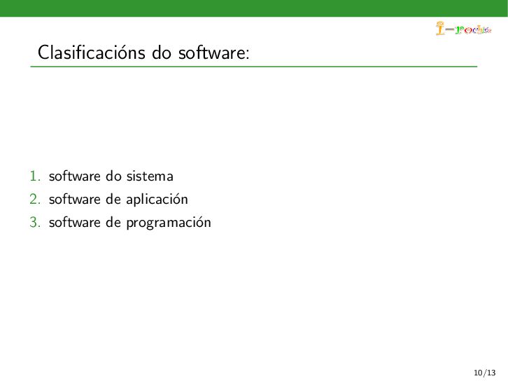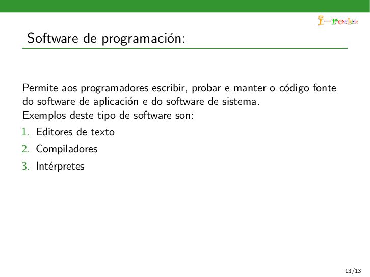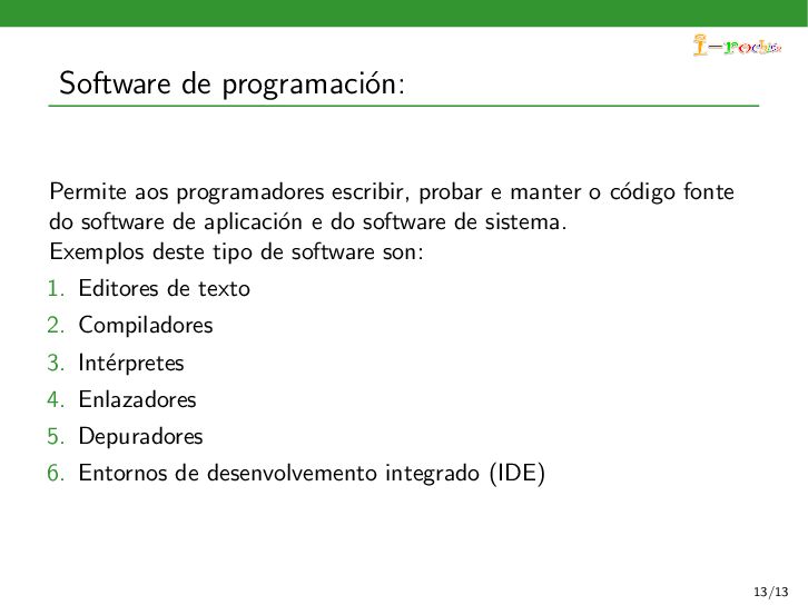 funcione, ocultando ao persoal inform´ atico os procesos internos deste funcionamento. Exemplos deste tipo de software son: 1. Sistemas operativos 2. Controladores de dispositivos 3. Ferramentas de diagn´ ostico 4. Servidores (correo, web, DNS,...) 5. Utilidades do sistema (compresi´ on de informaci´ on, rastreo de zoas defectuosas en soportes,...) 11/13
