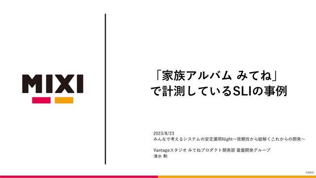 ©MIXI 「家族アルバム みてね」 で計測しているSLIの事例 2023/8/23 みんなで考えるシステムの安定運⽤Night〜信頼性から紐解くこれからの開発〜 Vantageスタジオ みてねプロダクト開発部 基盤開発グループ 清⽔