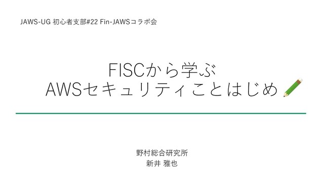 FISCから学ぶ AWSセキュリティことはじめ 野村総合研究所 新井 雅也 JAWS-UG 初⼼者⽀部#22 Fin-JAWSコラボ会