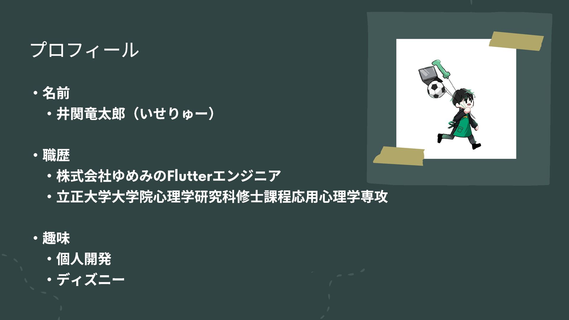 ・名前 ・井関竜太郎(いせりゅー) ・職歴 ・株式会社ゆめみのFlutter エンジニア ・立正大学大学院心理学研究科修士課程応用心理学専攻 ・趣味 ・個人開発 ・ディズニー プロフィール