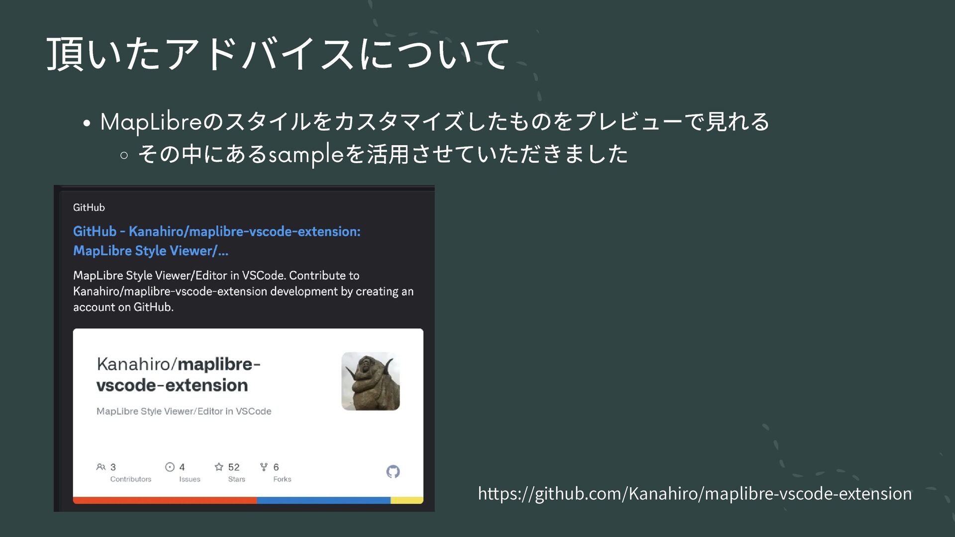 頂いたアドバイスについて MapLibre のスタイルをカスタマイズしたものをプレビューで見れる その中にあるsample を活用させていただきました https://github.com/Kanahiro/maplibre-vscode-extension