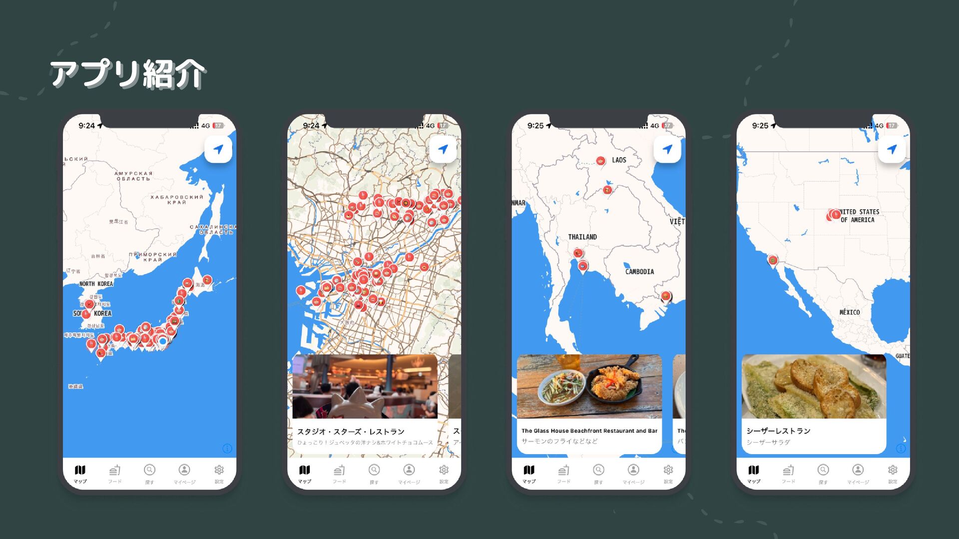 世界中のユーザーとフードのシェアができるアプリ アプリの魅力 このアプリ内だけのフードマップを作り上げられる 自分だけのフードアルバムを作成できる 世界中の美味しいレストランを見つけることができる アプリ紹介 アプリ紹介