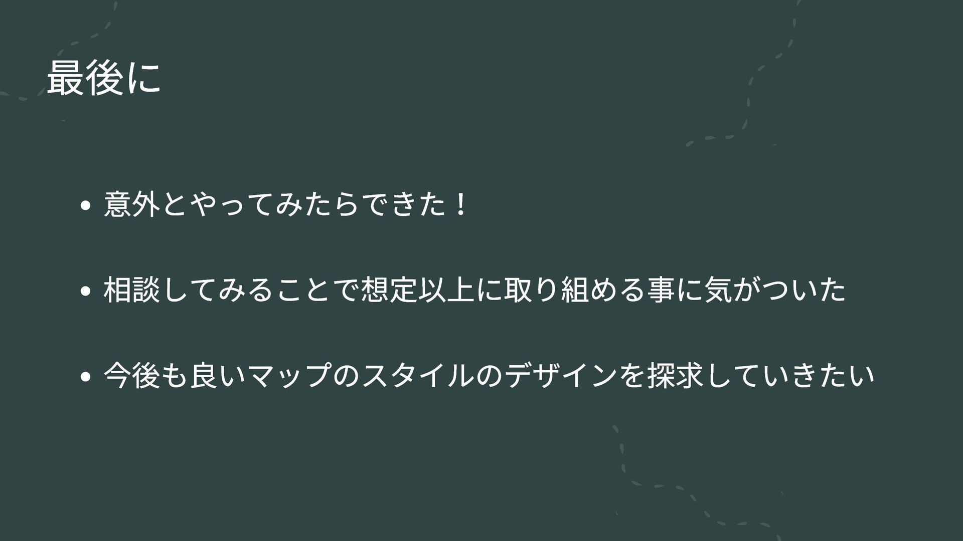 最後に 意外とやってみたらできた! 相談してみることで想定以上に取り組める事に気がついた 今後も良いマップのスタイルのデザインを探求していきたい