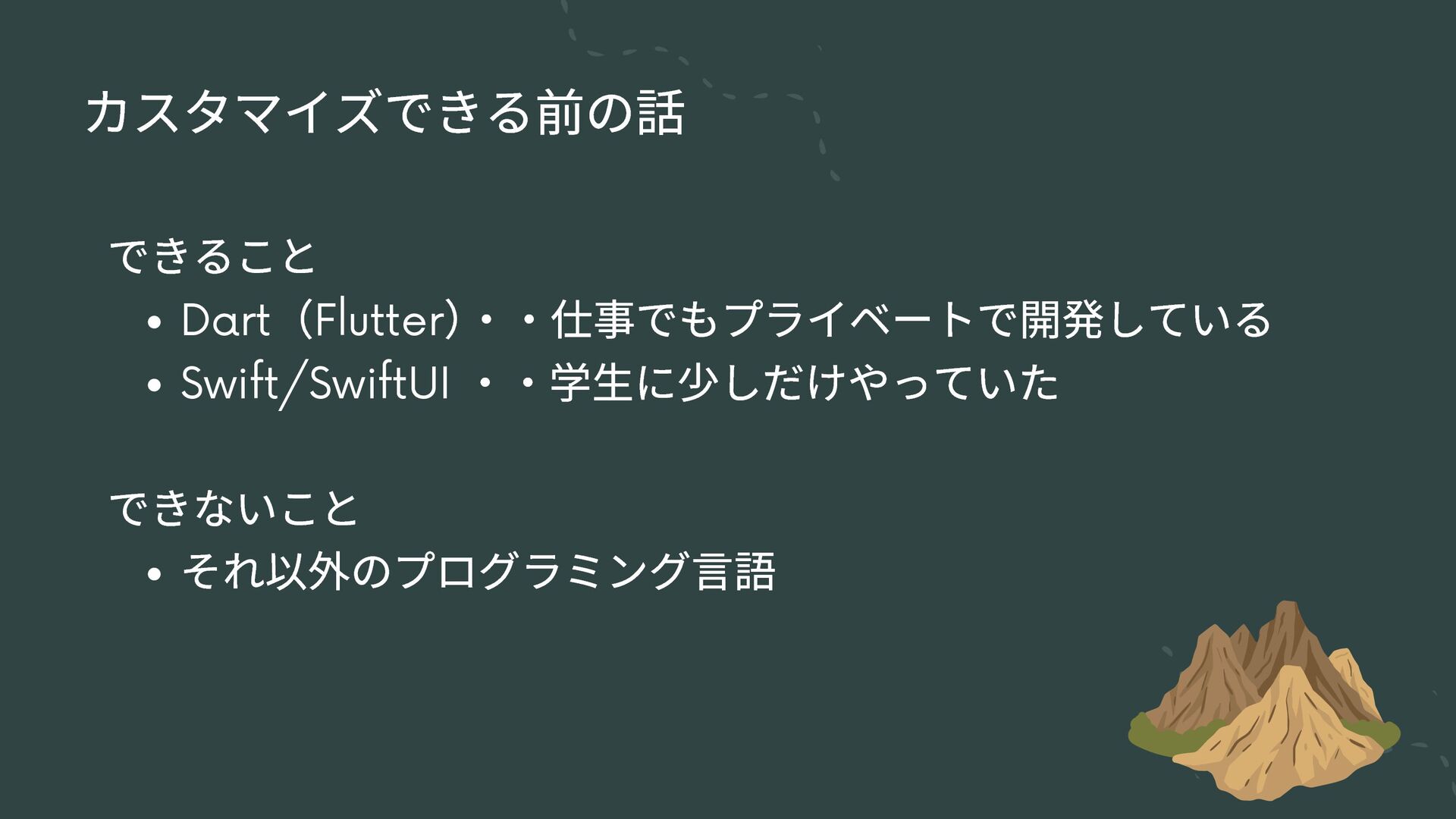 できること Dart (Flutter ) ・・仕事でもプライベートで開発している Swift/SwiftUI ・・学生に少しだけやっていた できないこと それ以外のプログラミング言語 カスタマイズできる前の話