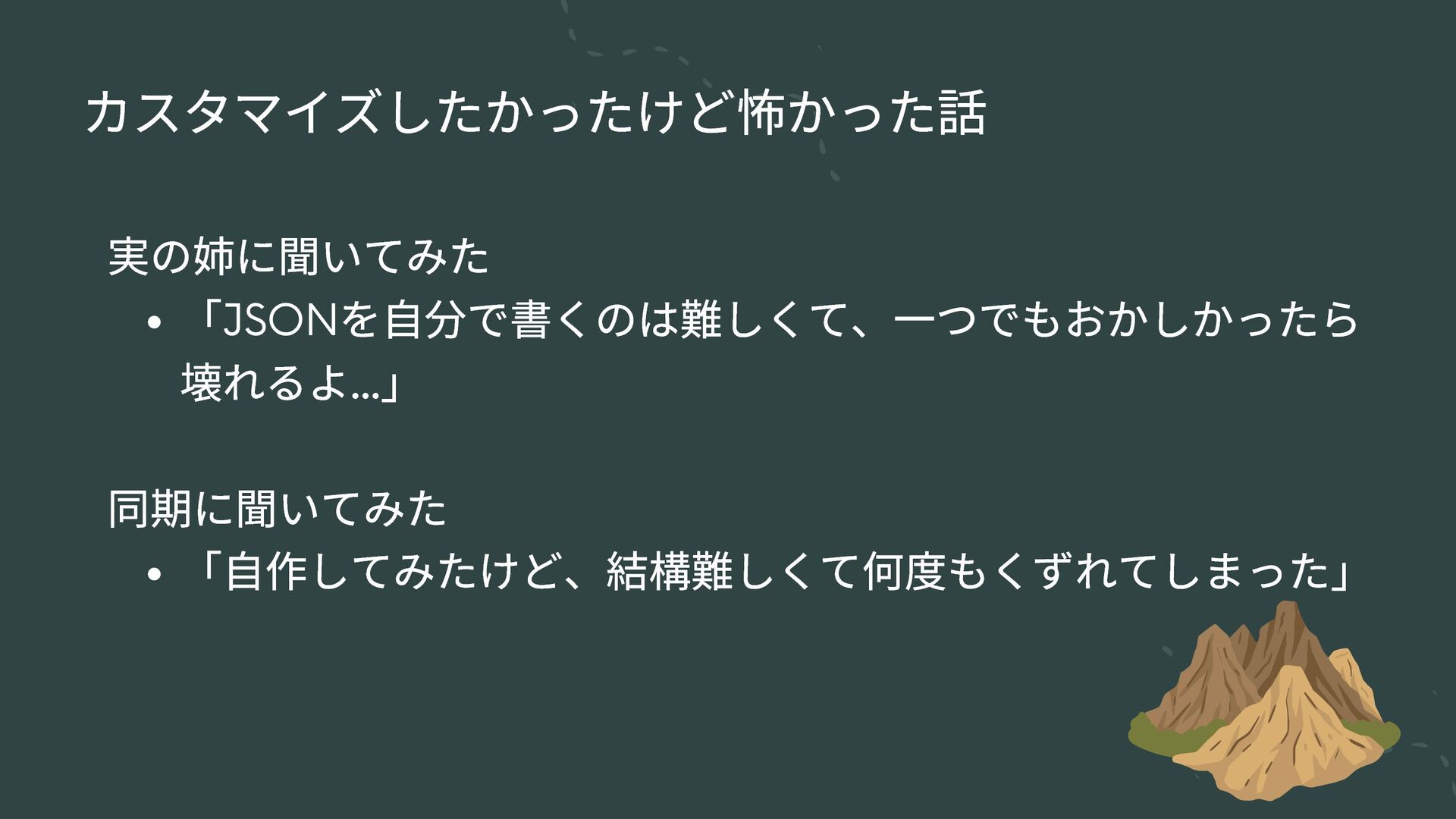 実の姉に聞いてみた 「JSON を自分で書くのは難しくて、一つでもおかしかったら 壊れるよ... 」 同期に聞いてみた 「自作してみたけど、結構難しくて何度もくずれてしまった」 カスタマイズしたかったけど怖かった話
